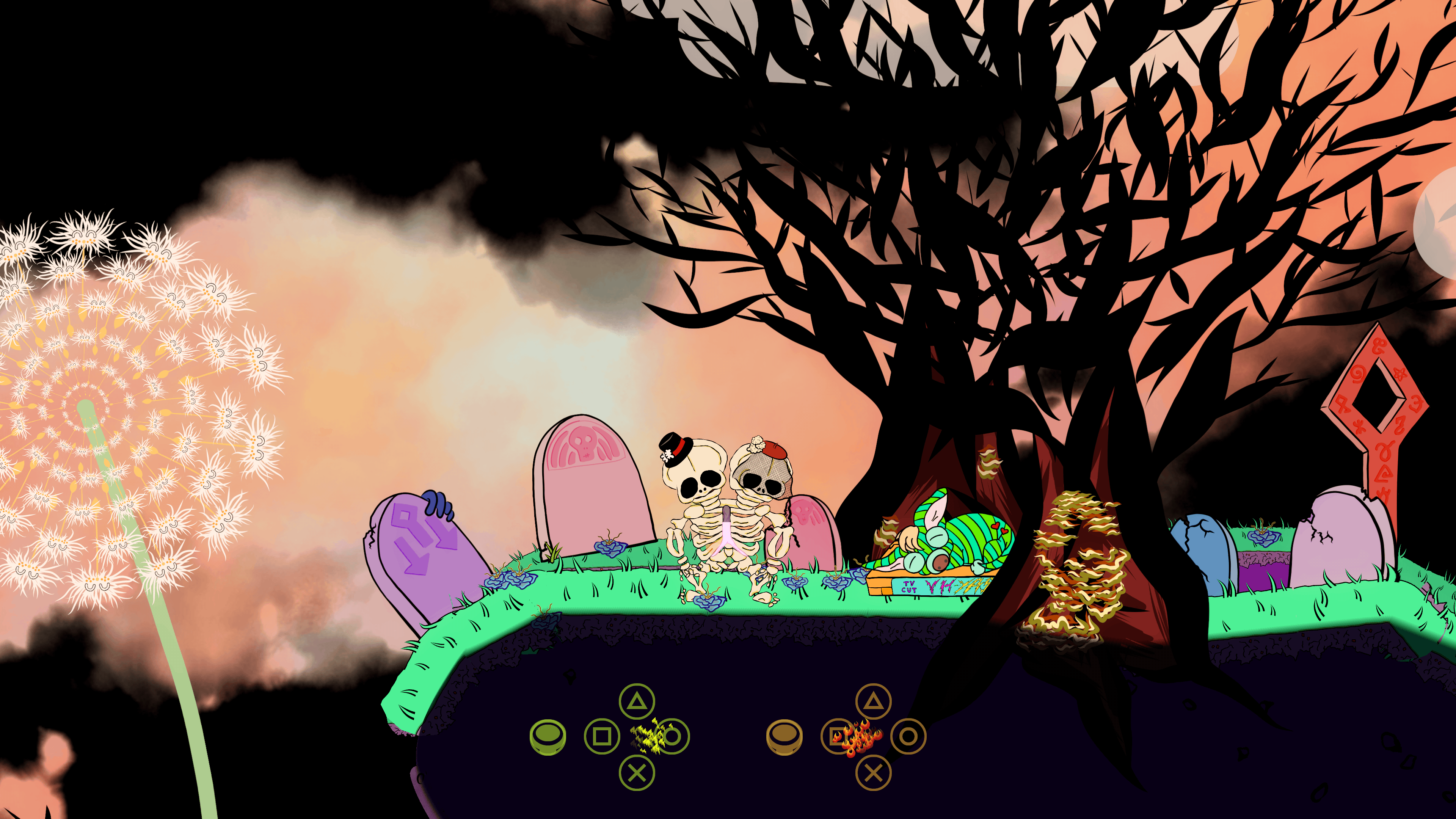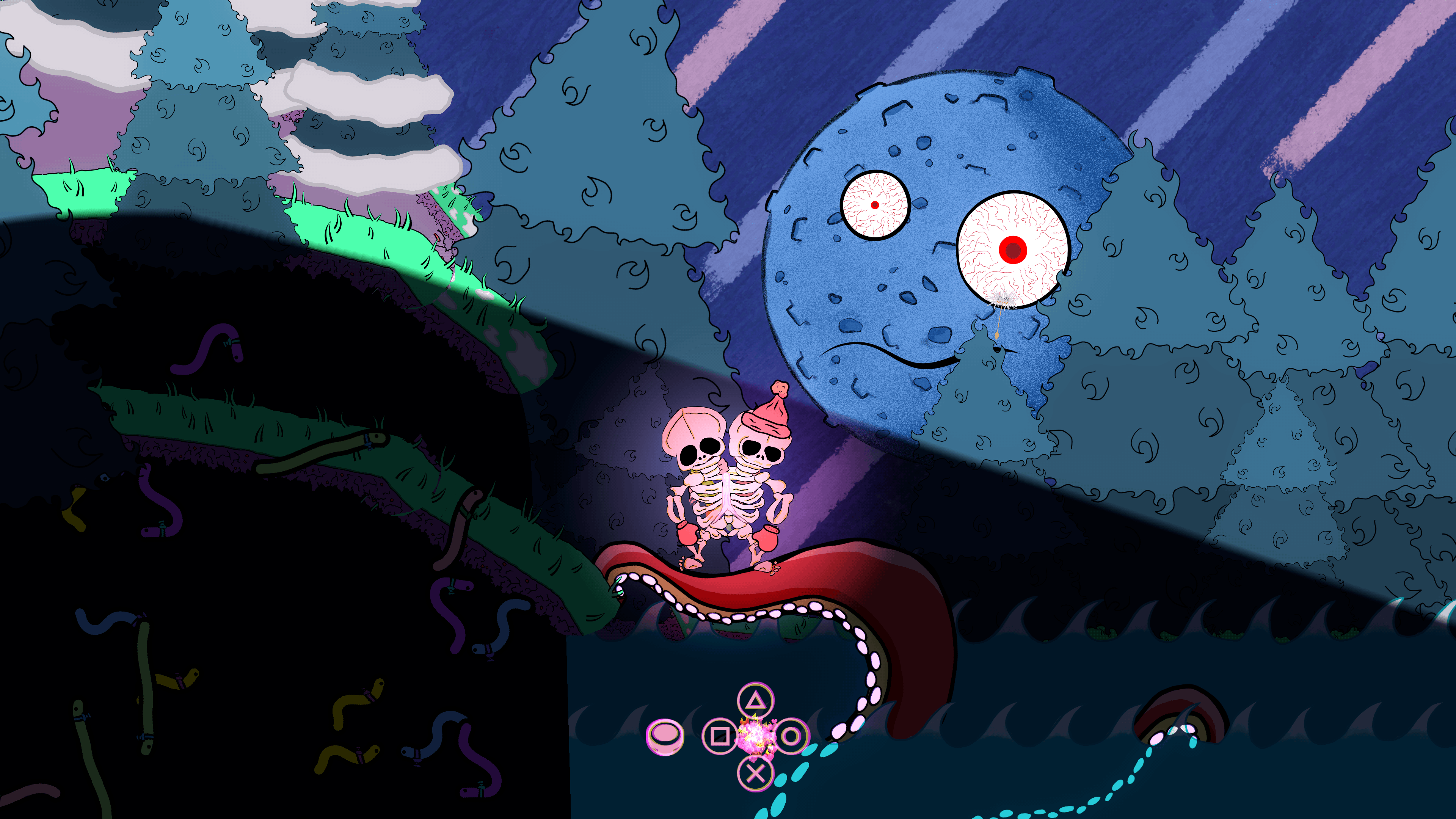 Gutterspace is a hand-drawn, local co-op game where you and a friend share control of a two-headed skeleton named Tittle and Dot. Every jump, every ability, every movement is split between two players. Stay in sync and you’ll move fluidly, even gaining bonuses. Drift apart, and the body stumbles.